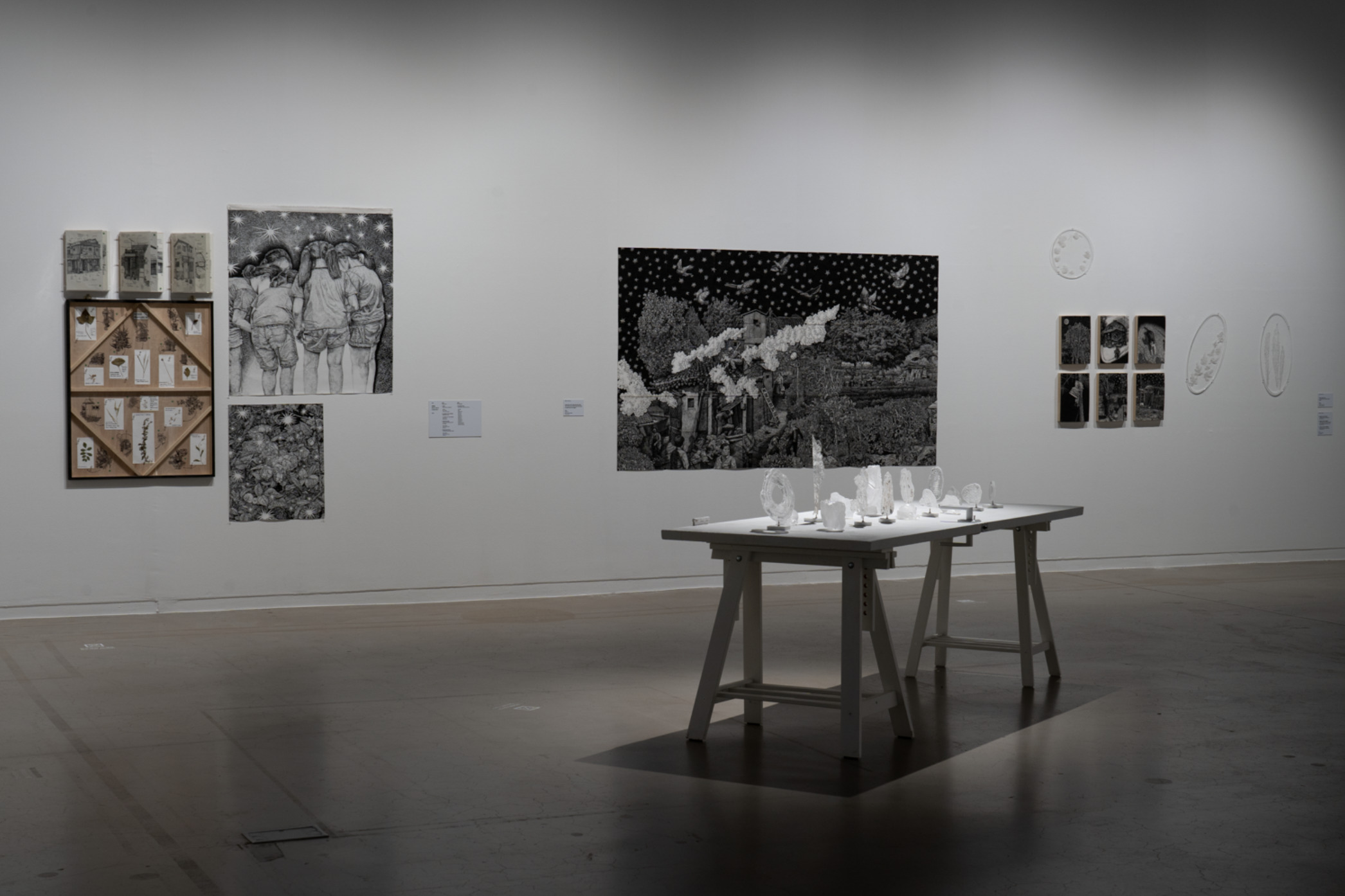 드러냄과 남김 등 상반되어 보이는 요소들이 상호 배제되지 않고 서로를 경유하며 동시에 작동하게 만든다. 이제 어둠과 밝음은 서로에게 닿는 자리에서 ‘채움’과 ‘여백’의 성질로 교차하며